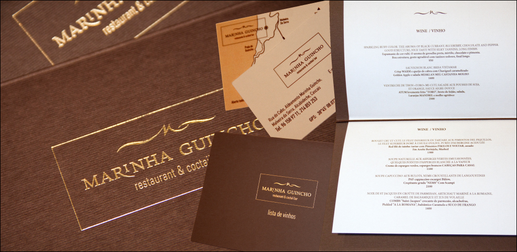 Брендирование Брендирование и создание серии макетов для ресторана Marinha Guincho (знак, логотип, папка-меню, винная карта, меню, папка счёт, визитная карточка ресторана) Креативная концепция. Графический дизайн. Блокноты, визитки, бланки. Папки. Плакаты, листовки, лифлеты. Создание сайтов. |