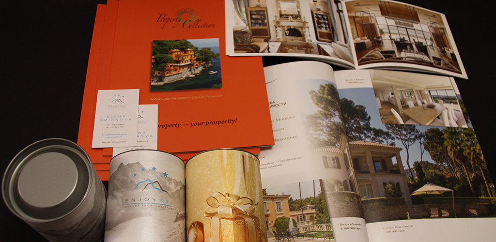 Буклеты, визитки, тубусы для чая и других сыпучих субстанций и прочие материалы для группы компаний Enjoy Ski, Properties for Rent и ВересК