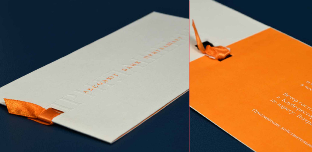 Белая бумага из коллекции Gmund Colors, шелкография поверх конгревного блинтового тиснения, высечка, крепление вкладыша в открытку сложным узлом атласной ленты.
