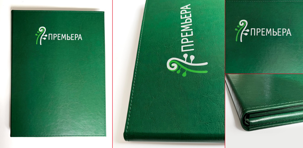 Жесткая оркестровая папка для Ансамбля солистов «Премьера» была сделана в соответствии с требованиями обновленного фирменного стиля. Создание макета, подбор уместных технологических решений с учетом требований клиента. Переплетный картон 2,5 мм, каширование лайнером из экокожи фирменного зеленого цвета под форзац в тон лайнеру из переплетного итальянского материала с прошивкой по краю, сложный карман для партитур. Тиснение белилами и шелкография фирменным салатовым.